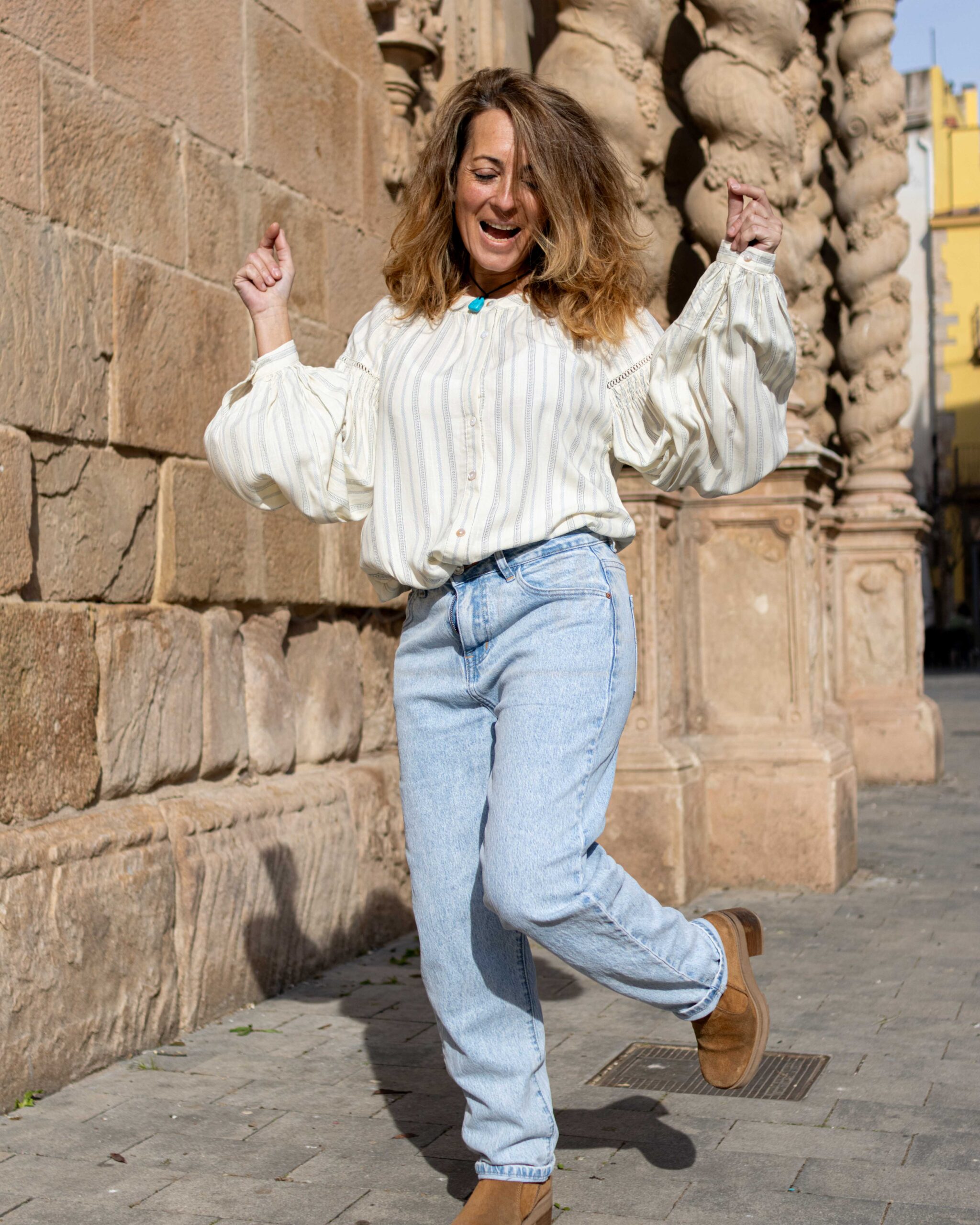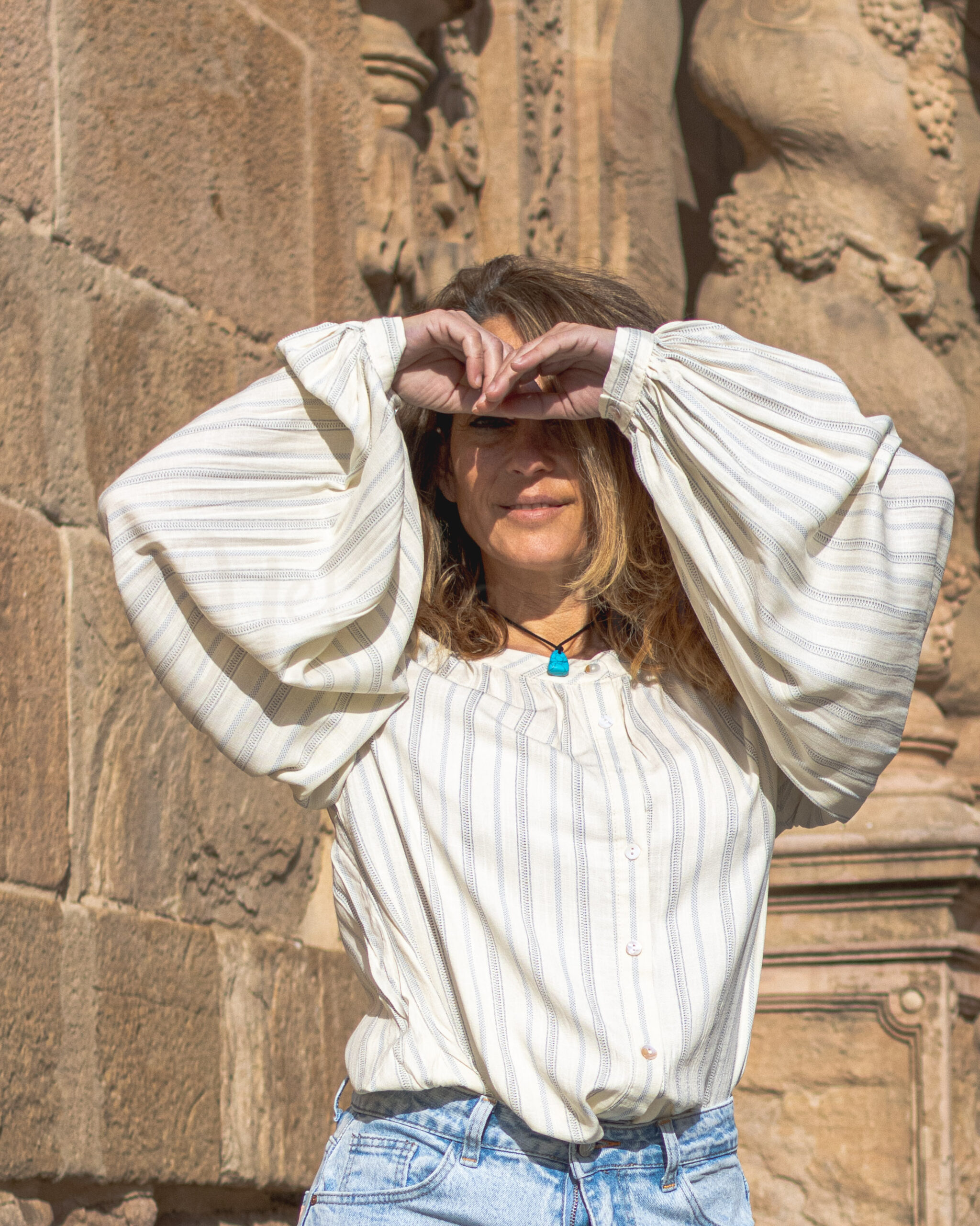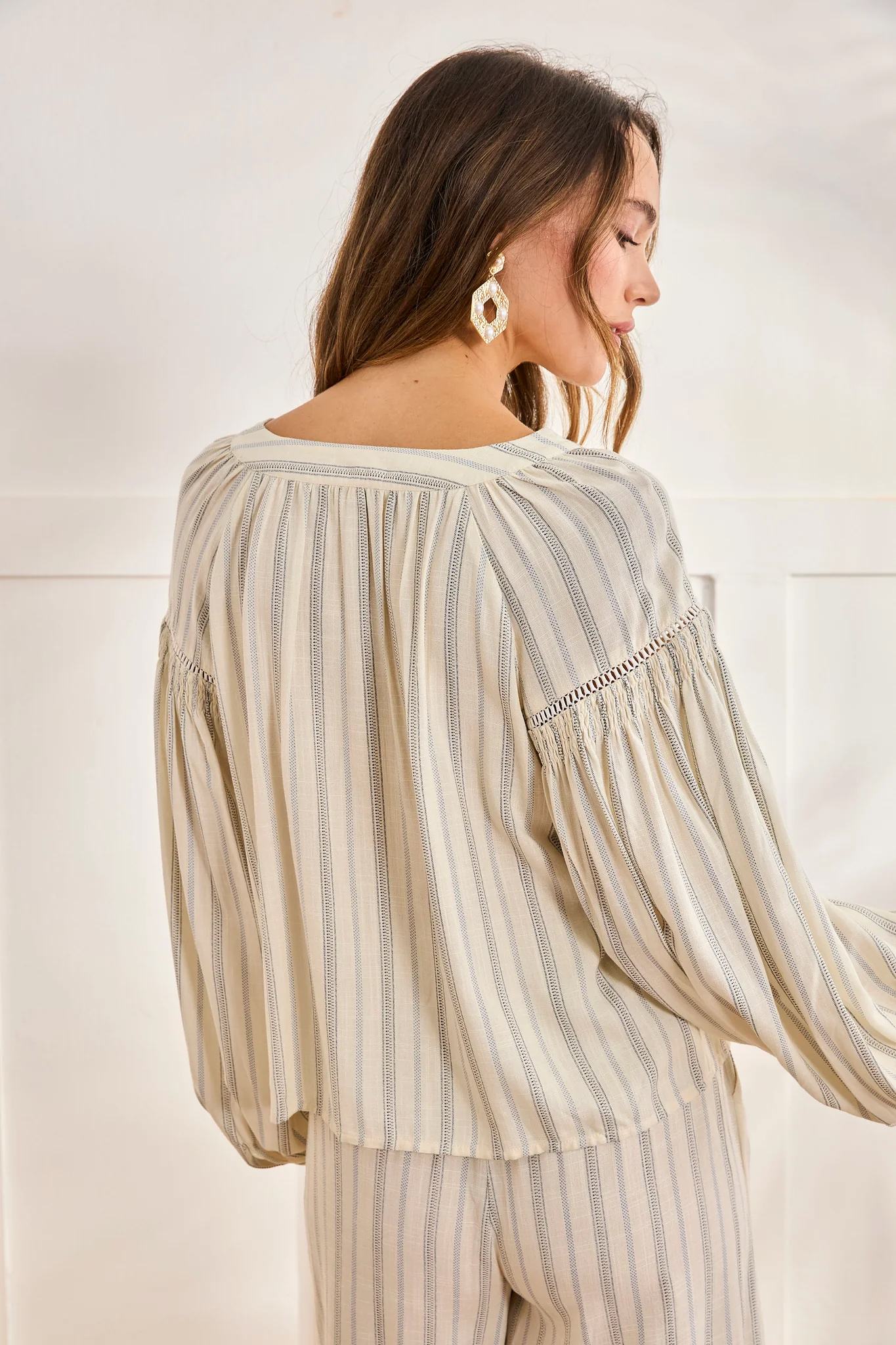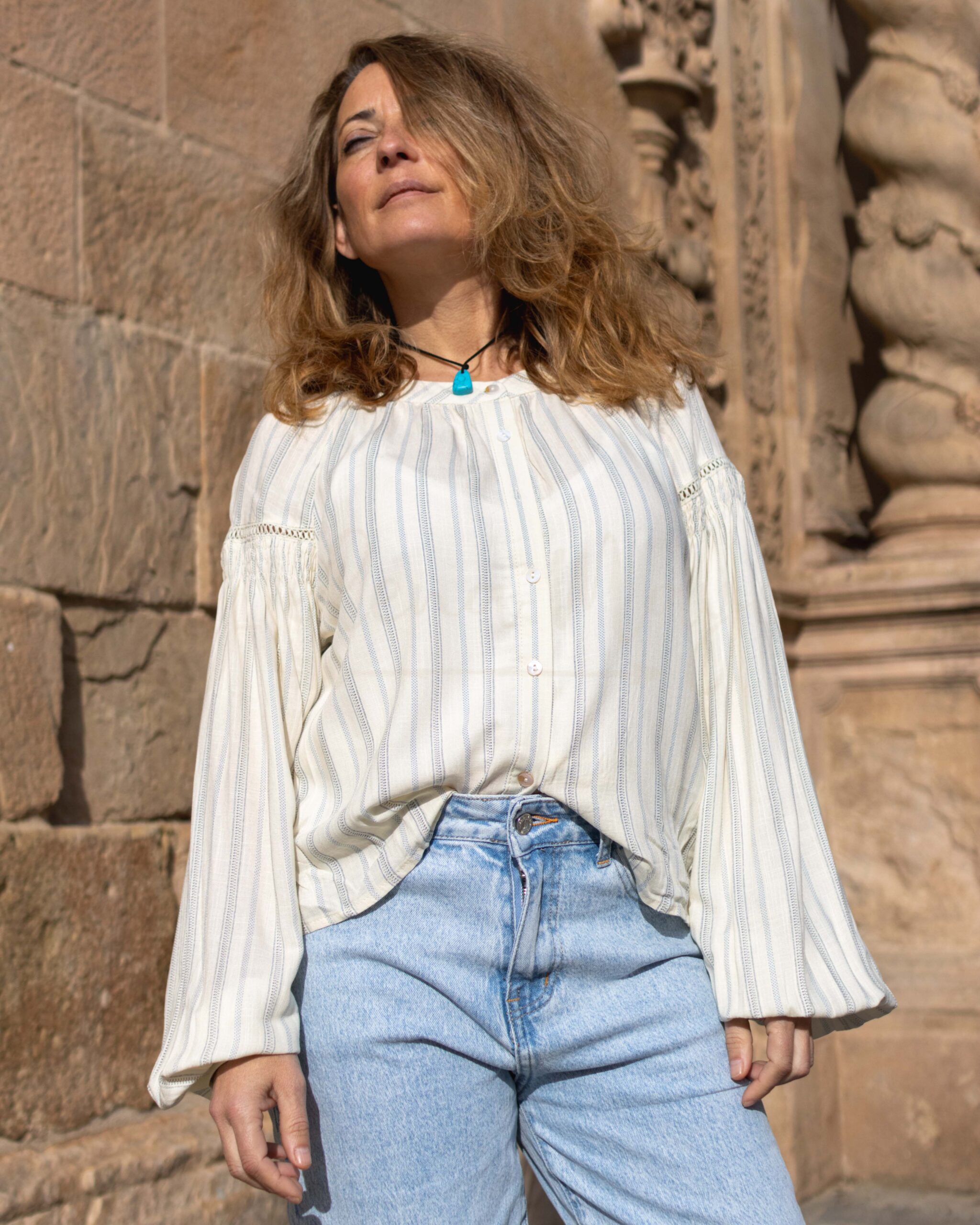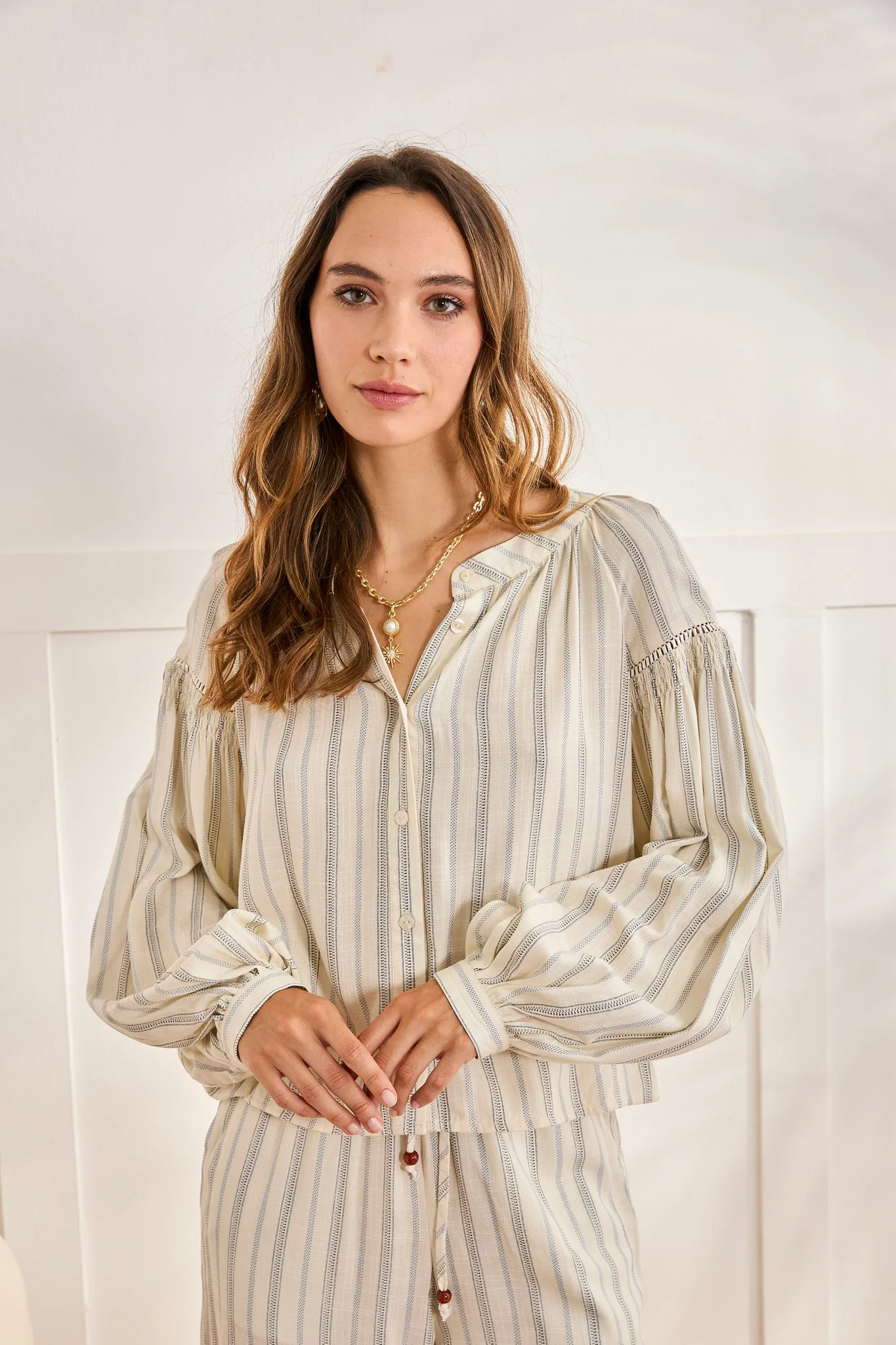 Blusa camisera de manga larga con cuello mao. Estampado mix de rayas. Botonadura frontal completa. Mangas abullonadas con detalle de calados y fruncido. Puños con botón.