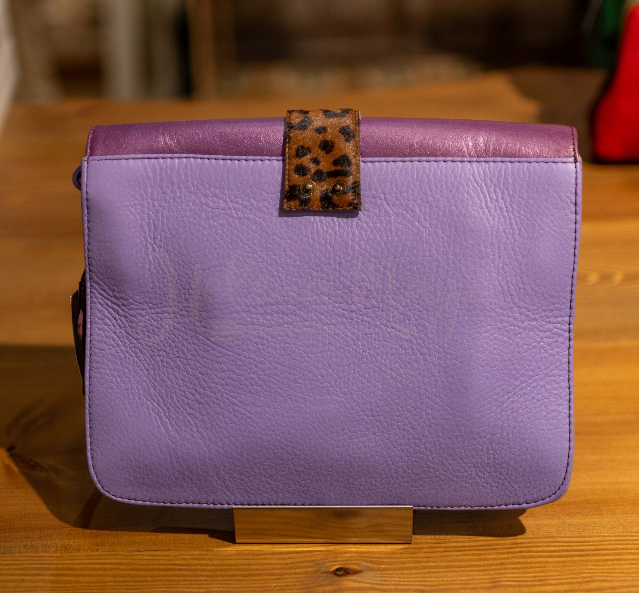 Bolso Soruka LAYLA en cuero reciclado, cierre con imán y tira reversible. Efecto «glitter» en la solapa de cierre. Bolsillo delantero con cierre en cremallera y correas en cuero extraíbles para poder llevarlo colgado o como bandolera. Medidas: 27cm x 22cm.