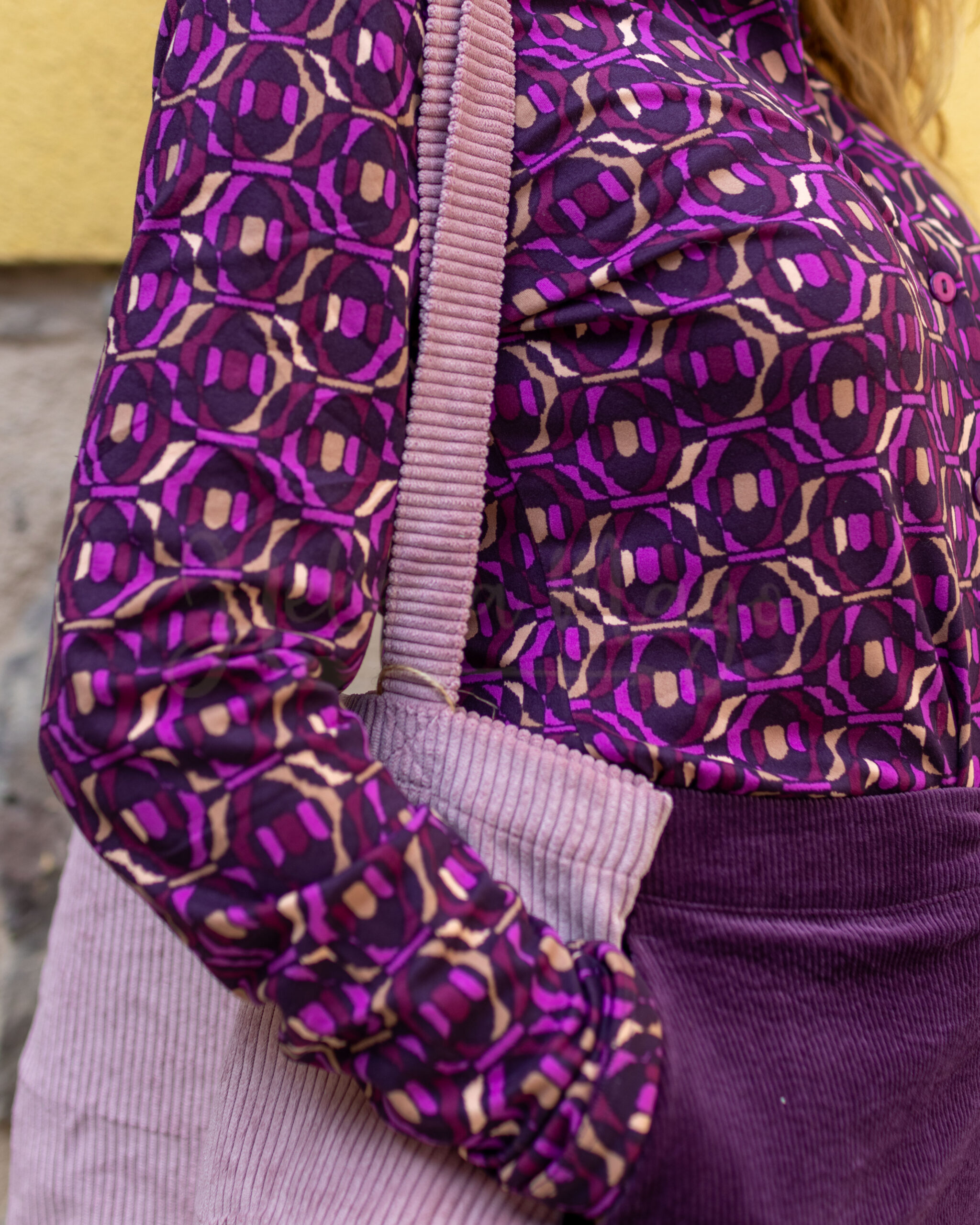 Camisa elástica estampada de manga larga y cuello solapa. Cierre frontal con botones.