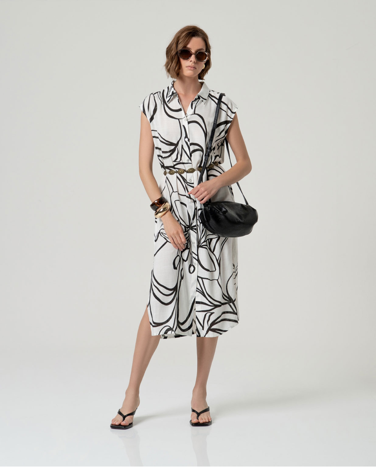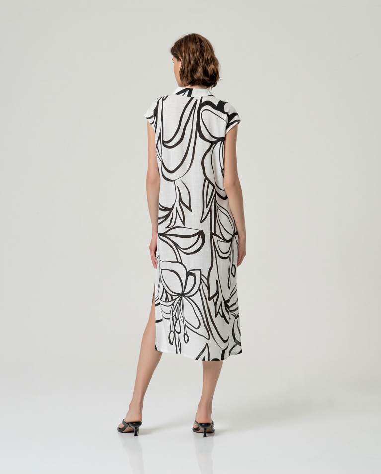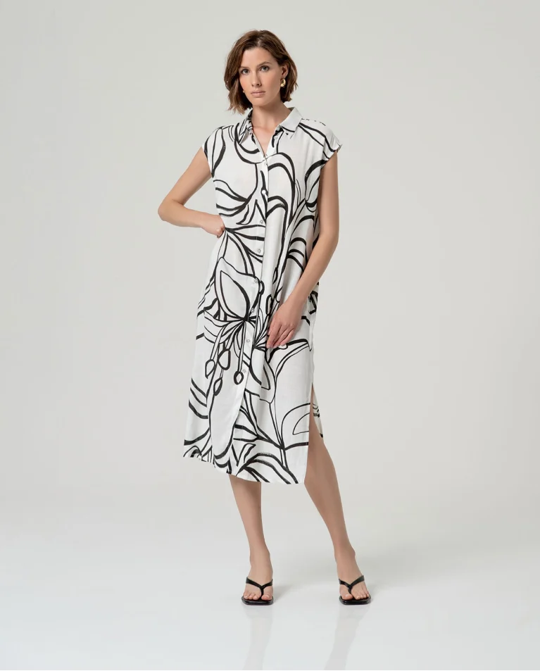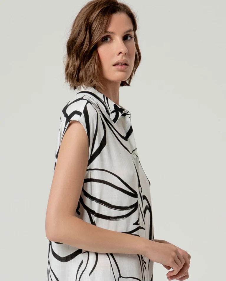 Camisa larga sin mangas de escote pico. Diseño de silueta recta con cierre frontal mediante botones y aberturas laterales que aportan movimiento. Confeccionada en tejido de viscosa, con caída natural