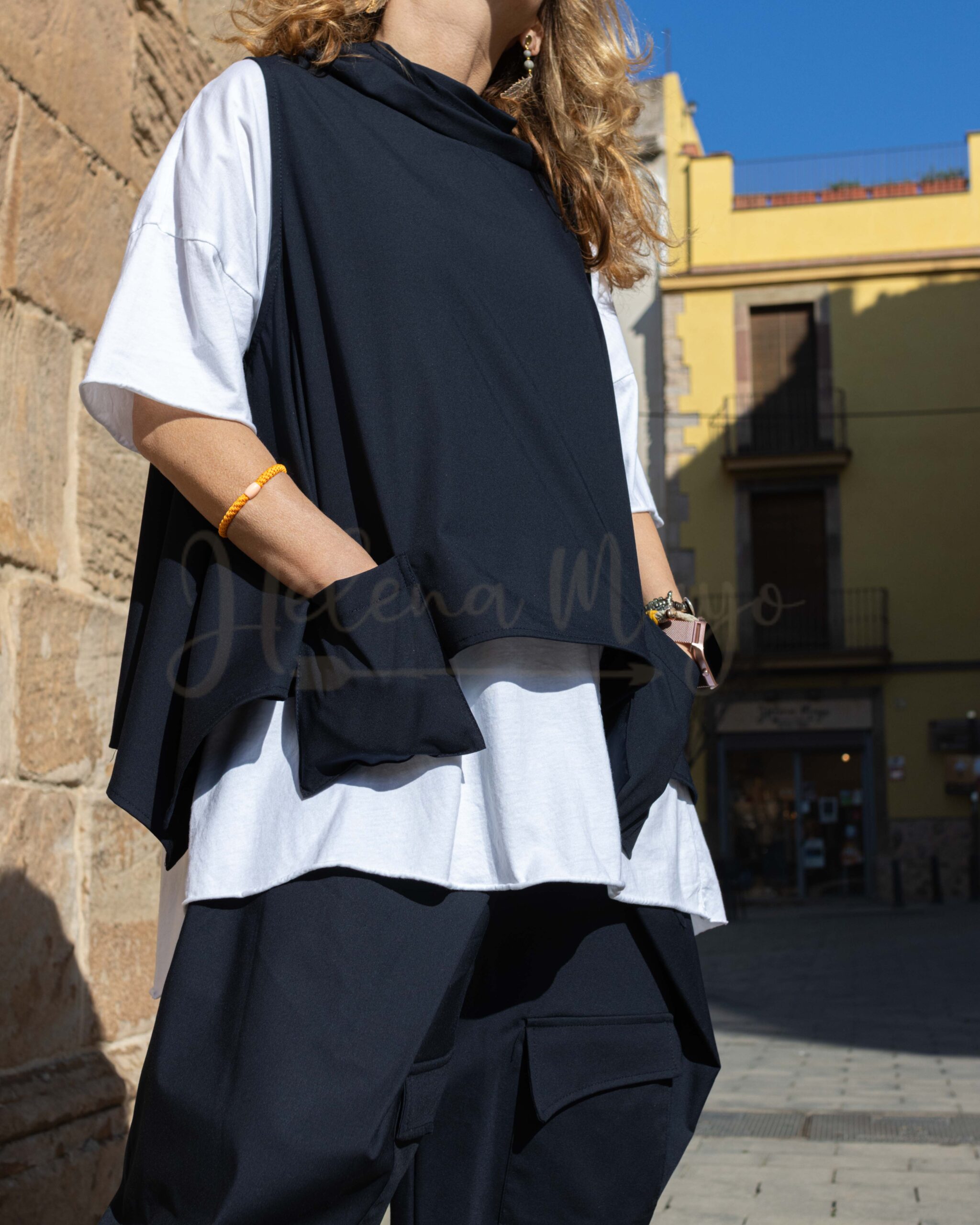 Chaleco de sarga en mezcla de viscosa. Cuello alto suave. Sin mangas. Bolsillos delanteros aplicados con dobladillo libre. Corte trapecio.