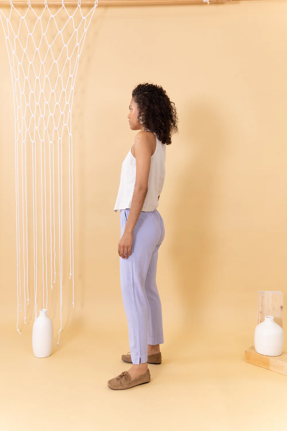 De línea limpia y ajuste entallado, este pantalón cropped de lino presenta un tiro medio-alto y sutiles aberturas en los bajos que estilizan la figura. Su diseño equilibra la ligereza del lino con una estética pulida y contemporánea.