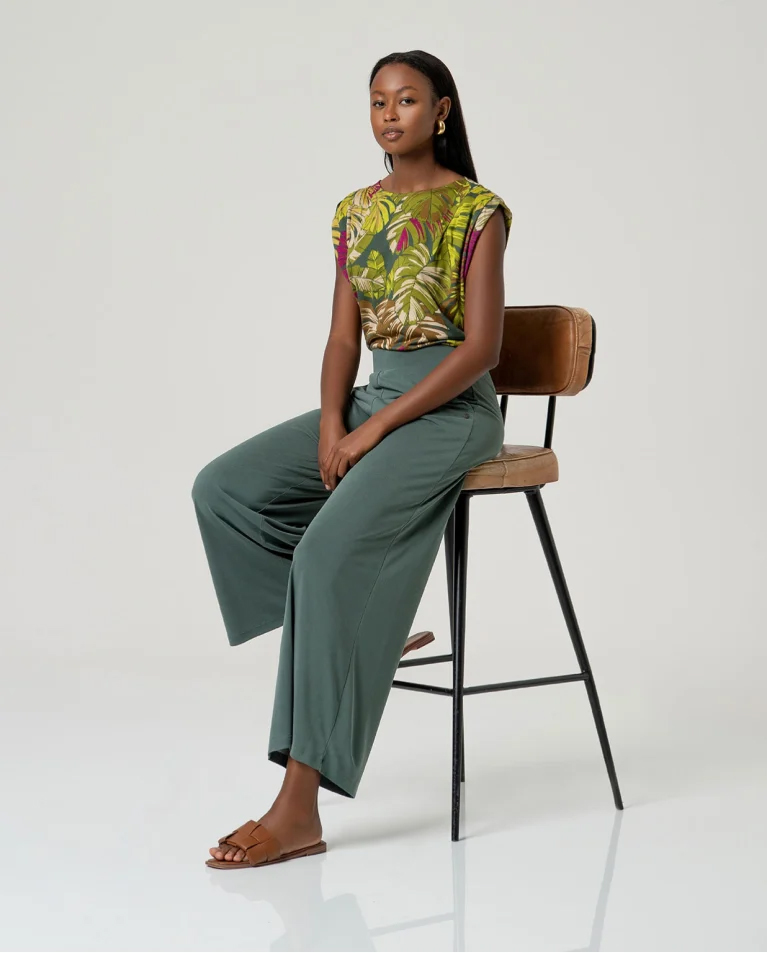 PANTALON DE PUNTO CON CINTURA ELÁSTICA, DE TIRO ALTO Y PIERNA ANCHA. SU TEJIDO SEDOSO CON CAÍDA LE APORTA FLUIDEZ Y COMODIDAD.