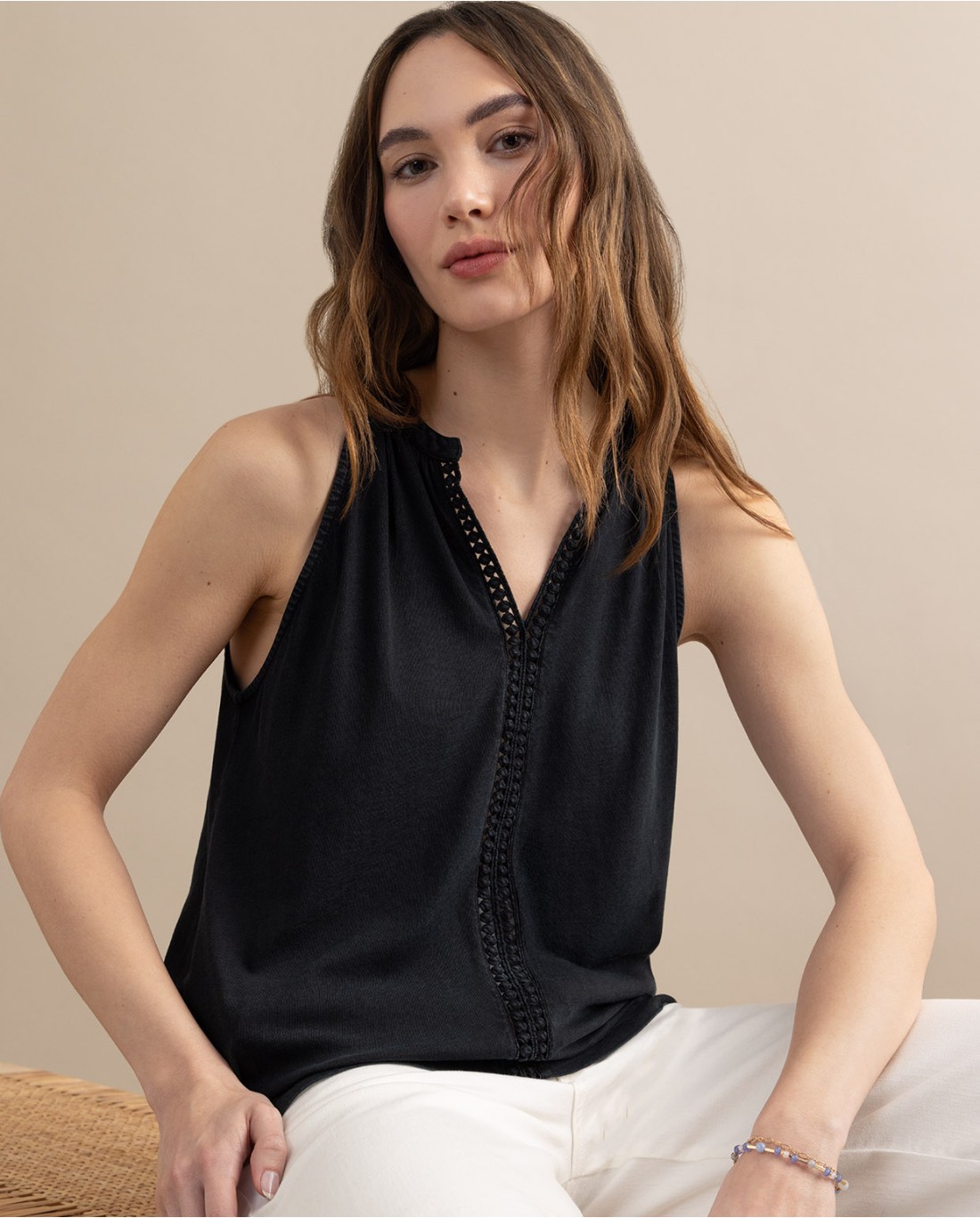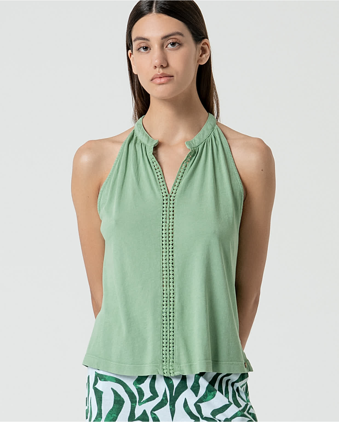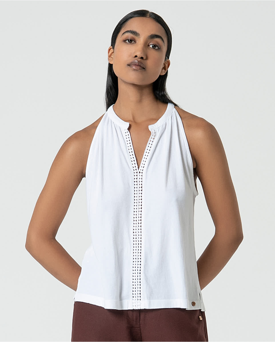 Top cuello halter abierto con detalle de encaje frontal. Confeccionado en algodón orgánico, suave y elástico.