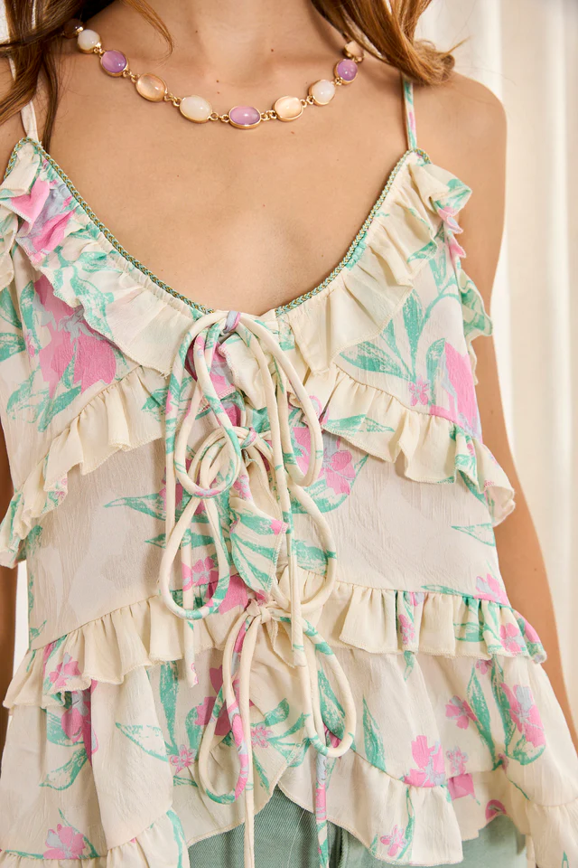 Top fluido de volantes con estampado floral y jacquard. Escote redondo con tirantes regulables. Abertura frontal con cierre de lazos.