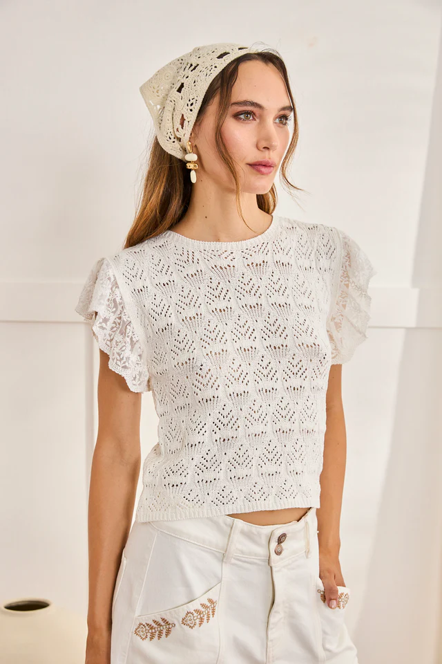 Top de punto calado con cuello redondo. Detalle de manga con volante de blonda.