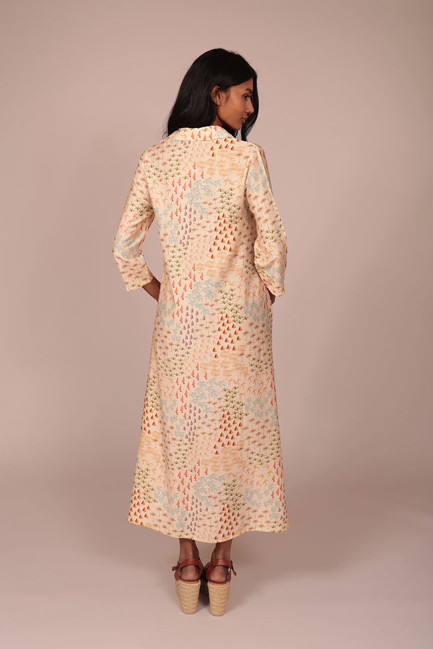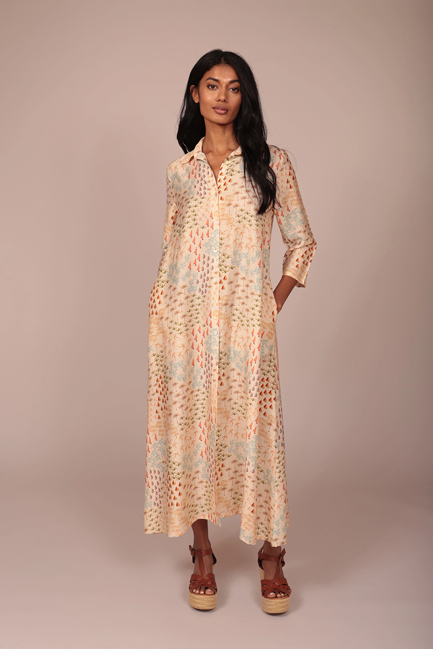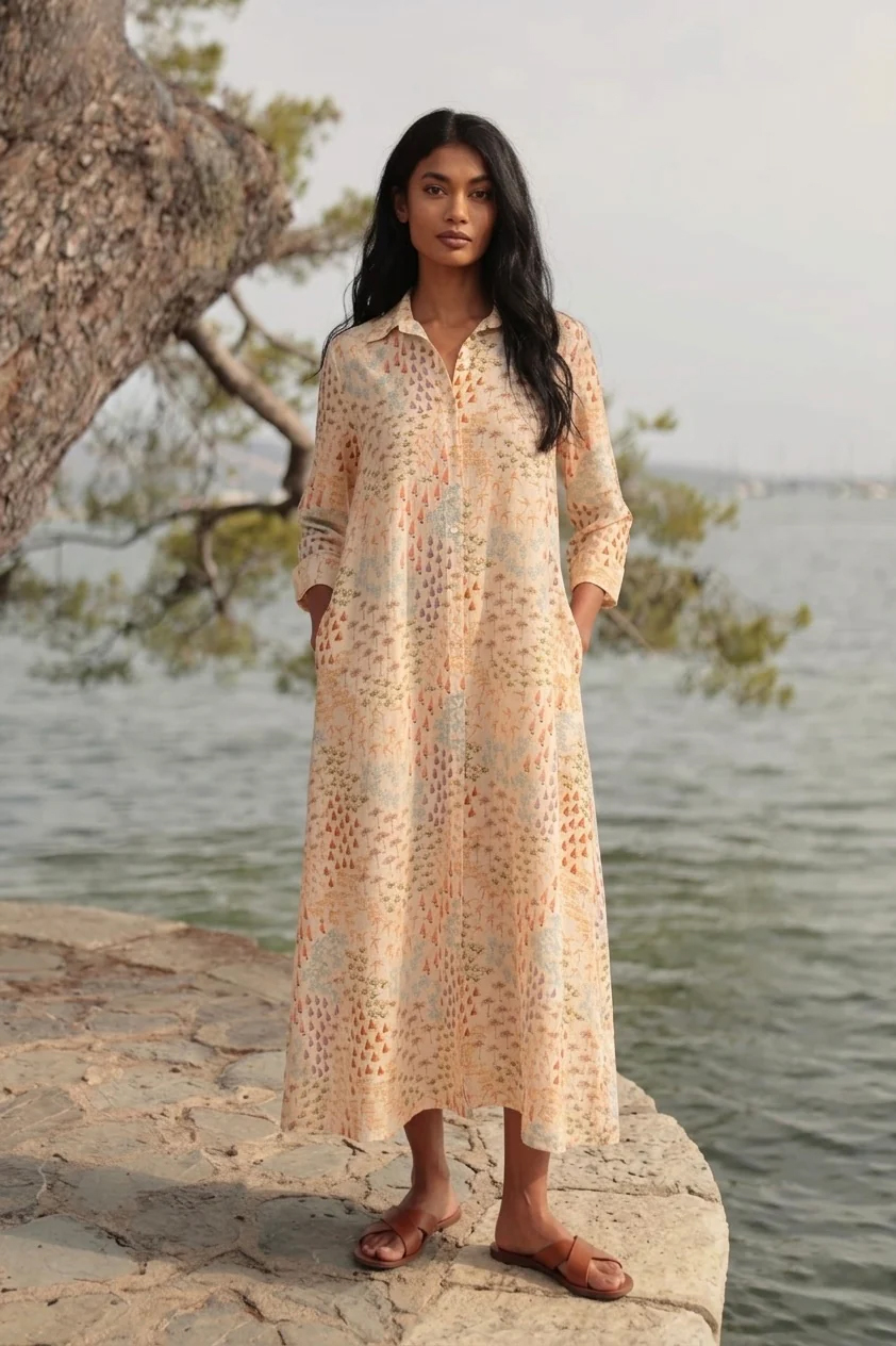 Disfruta de la ligereza del verano con nuestro vestido camisero largo, una prenda diseñada para ofrecerte máxima frescura sin renunciar a la elegancia. Su silueta fluida destaca por un exclusivo estampado de inspiración costera en tonos suaves que evocan la calma de los días de sol. Presenta un cierre frontal de botones, cuello clásico y prácticas mangas tres cuartos que aportan versatilidad para cualquier ocasión estival. Gracias a su tejido vaporoso y su corte holgado, te garantiza libertad de movimiento y comodidad absoluta durante todo el día. Es la opción ideal para un look desenfadado y chic si lo combina con sandalias de cuña y complementos de rafia. Redefine tu armario de vacaciones con esta pieza clave que combina funcionalidad y diseño artístico en una sola prenda.