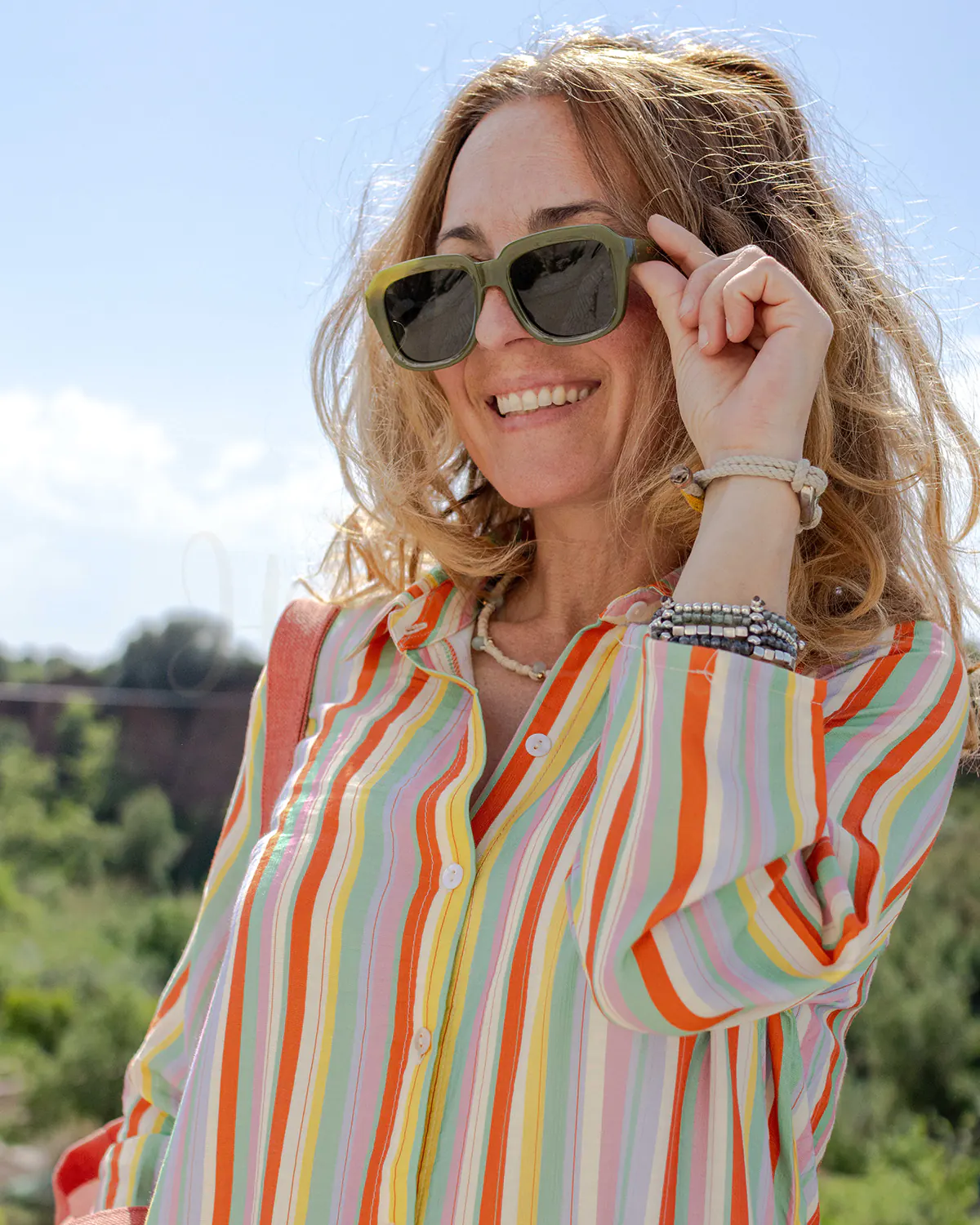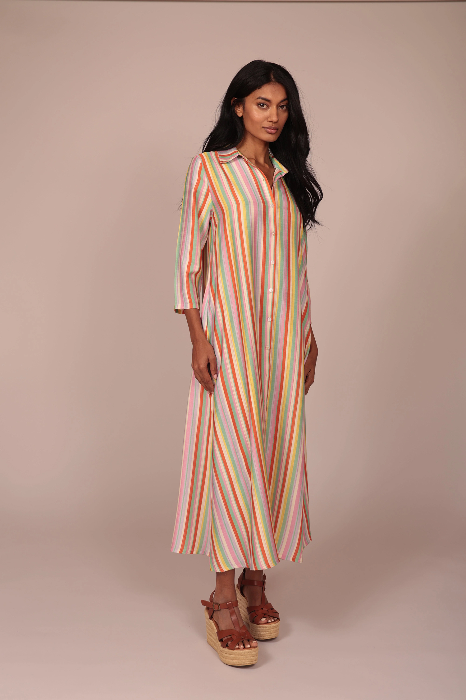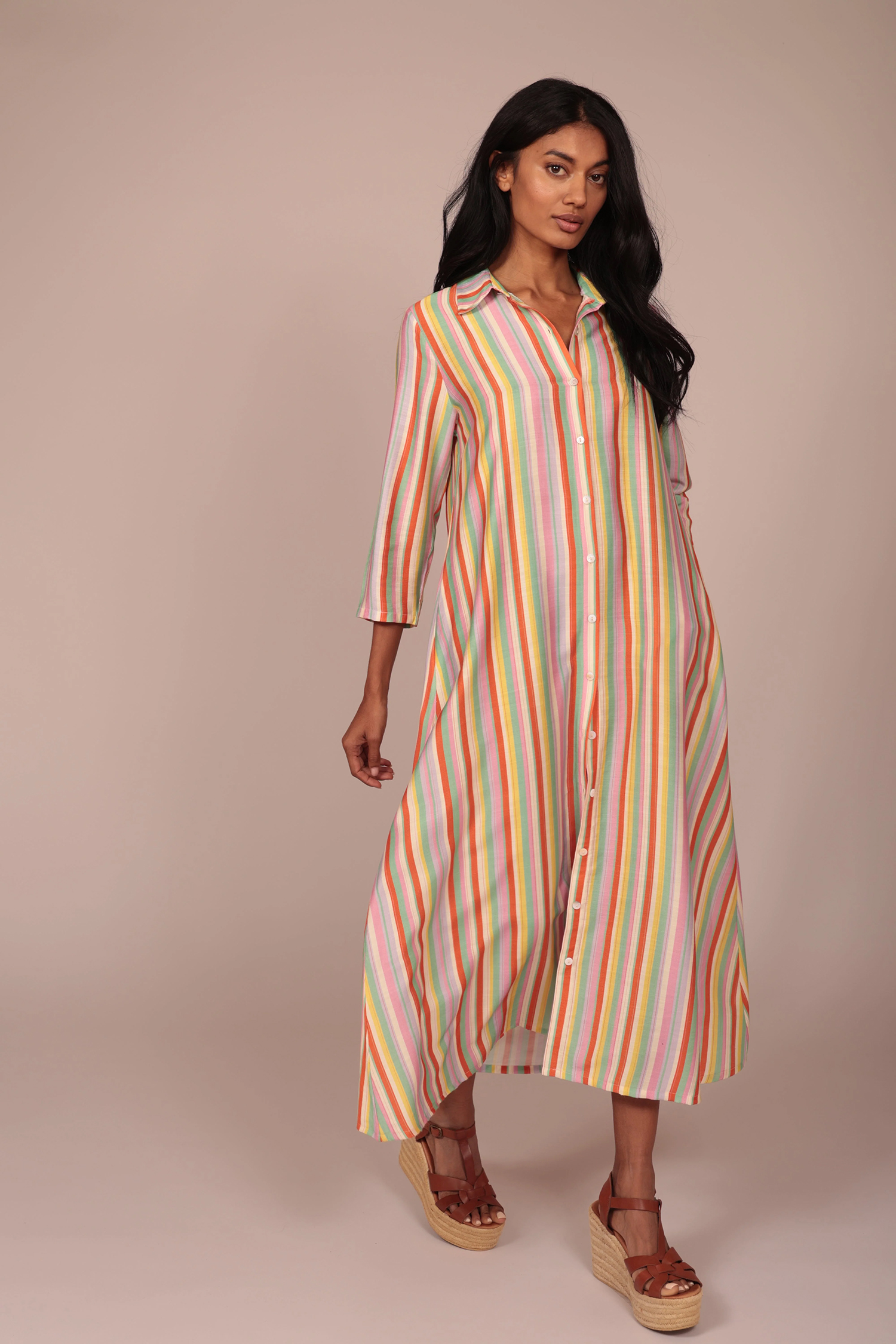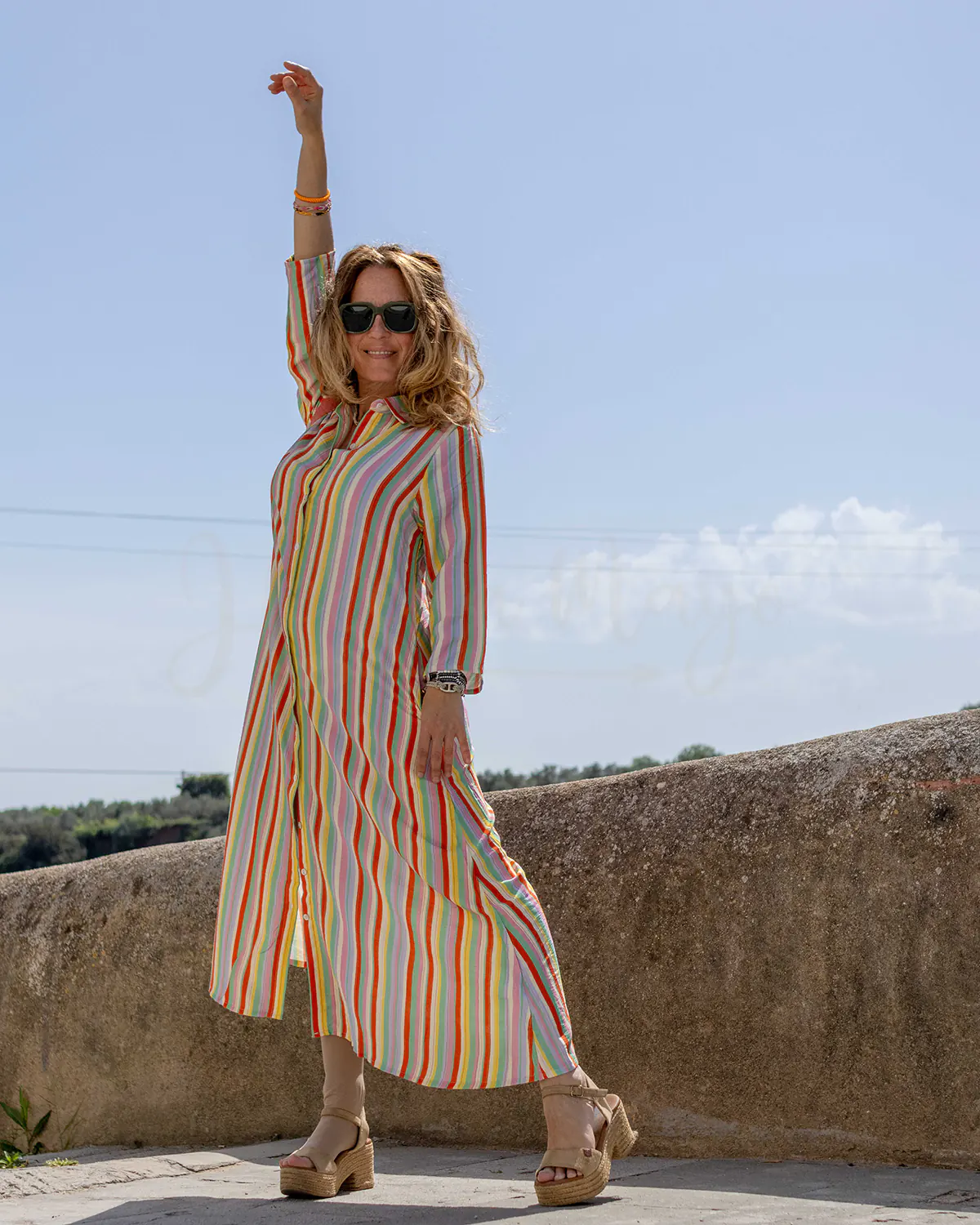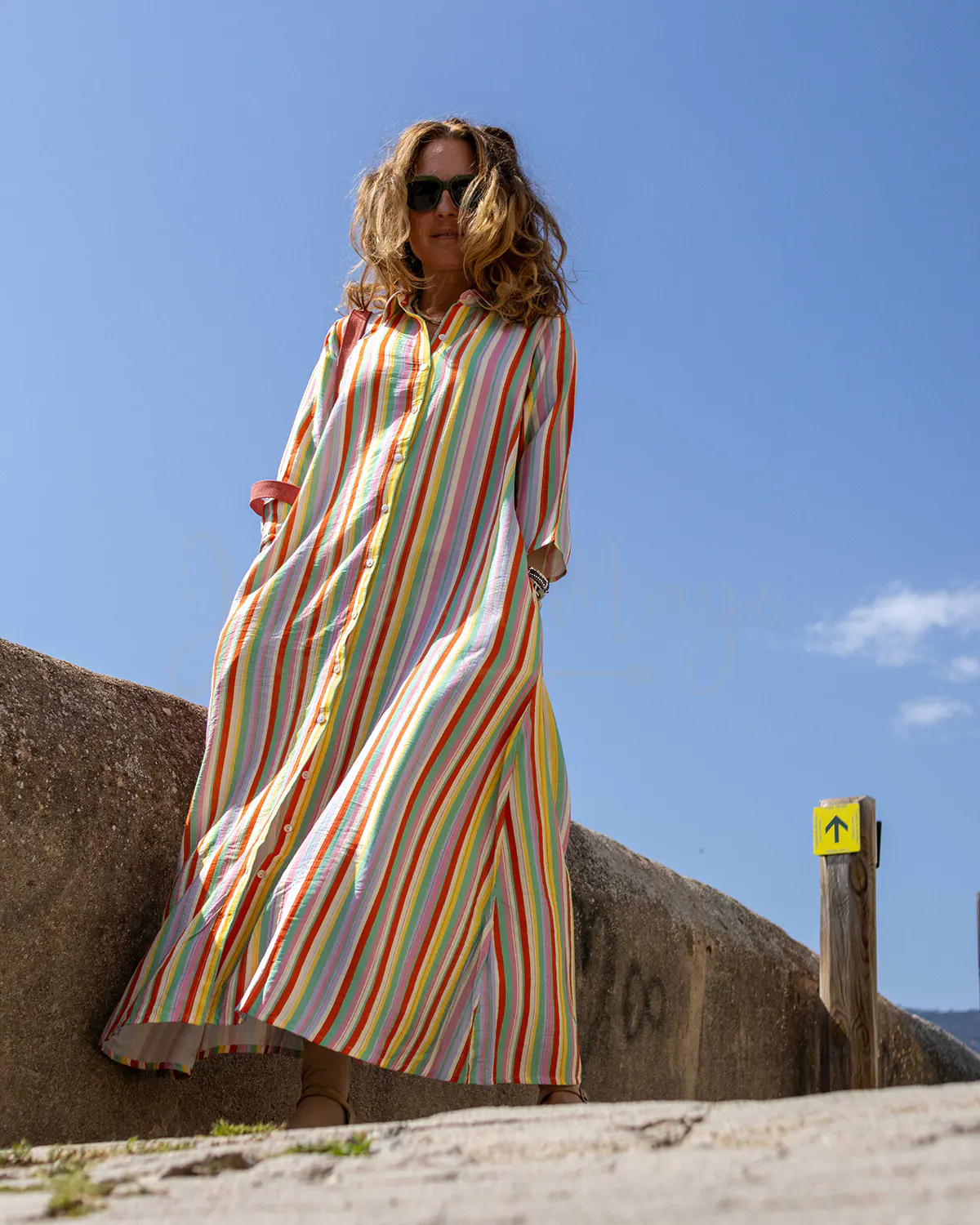 Irradia energía positiva con nuestro vestido camisero largo de rayas multicolor, la prenda estrella para un verano vibrante y lleno de estilo. Su diseño de líneas verticales en tonos pastel y cítricos no solo estiliza la figura, sino que aporta una frescura visual incomparable a tus días de sol. Confeccionado con un tejido liviano de caída impecable, este vestido cuenta con una botonadura frontal completa y mangas tres cuartos que permiten jugar con el look según la ocasión. La silueta fluida se complementa con discretos bolsillos laterales, fusionando la comodidad absoluta con una estética contemporánea y chic. Ya sea para un evento especial o un almuerzo relajado, su corte oversize refinado garantiza libertad de movimiento y un aire sofisticado sin esfuerzo. Combínalo con sandalias de cuña para elevar el conjunto y convertirte en el centro de todas las miradas esta temporada.