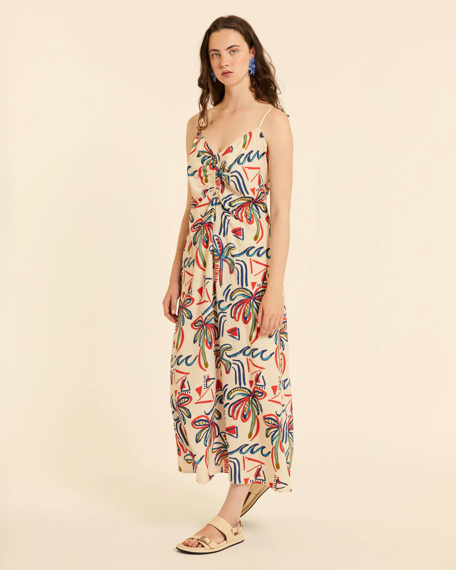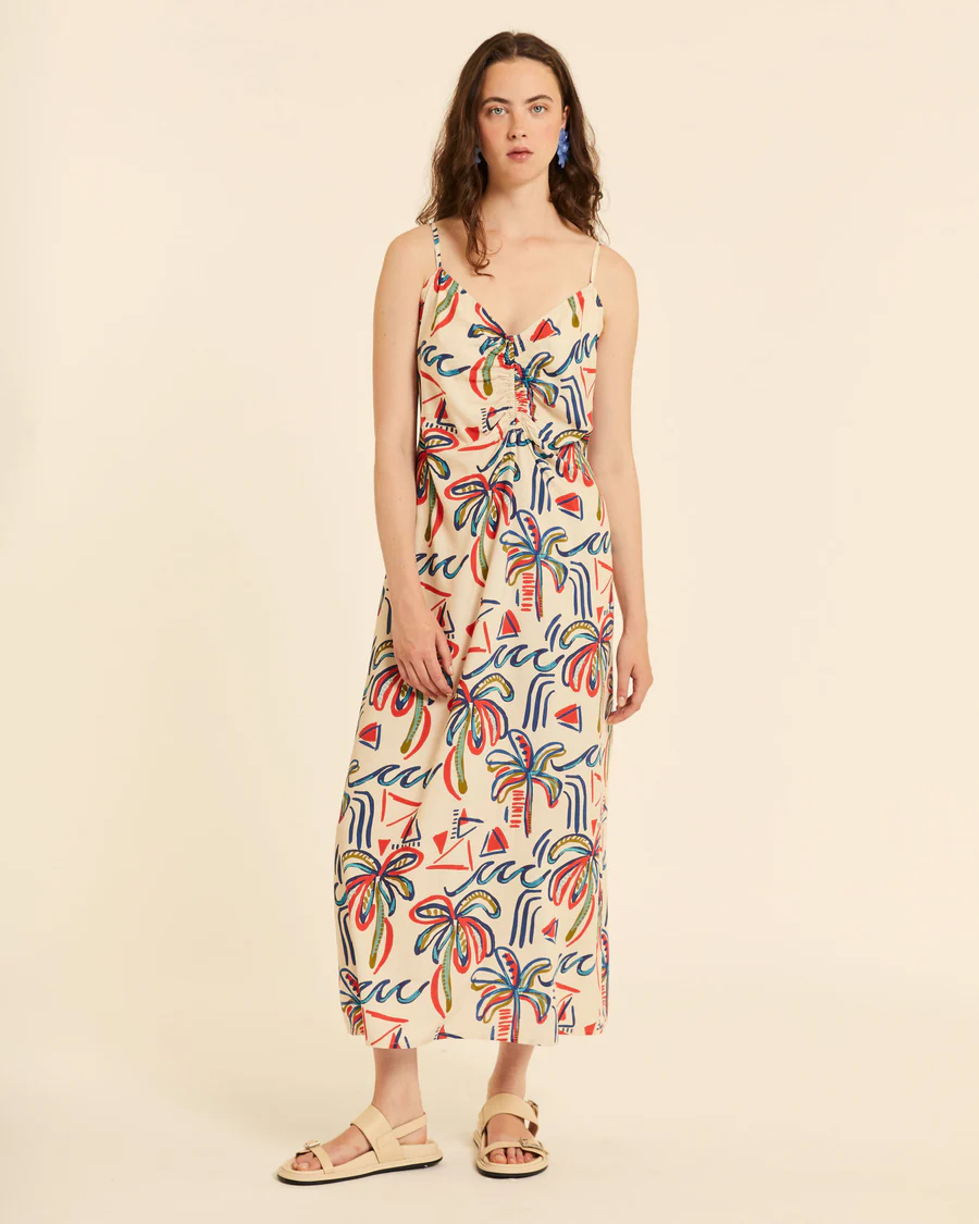 En la parte superior, presenta un escote en pico (V) bastante favorecedor, acompañado de tirantes finos, lo que le da un aire delicado y veraniego. En el centro del pecho dispone de un detalle fruncido con lazada, que añade un punto femenino y permite ajustar ligeramente el escote.