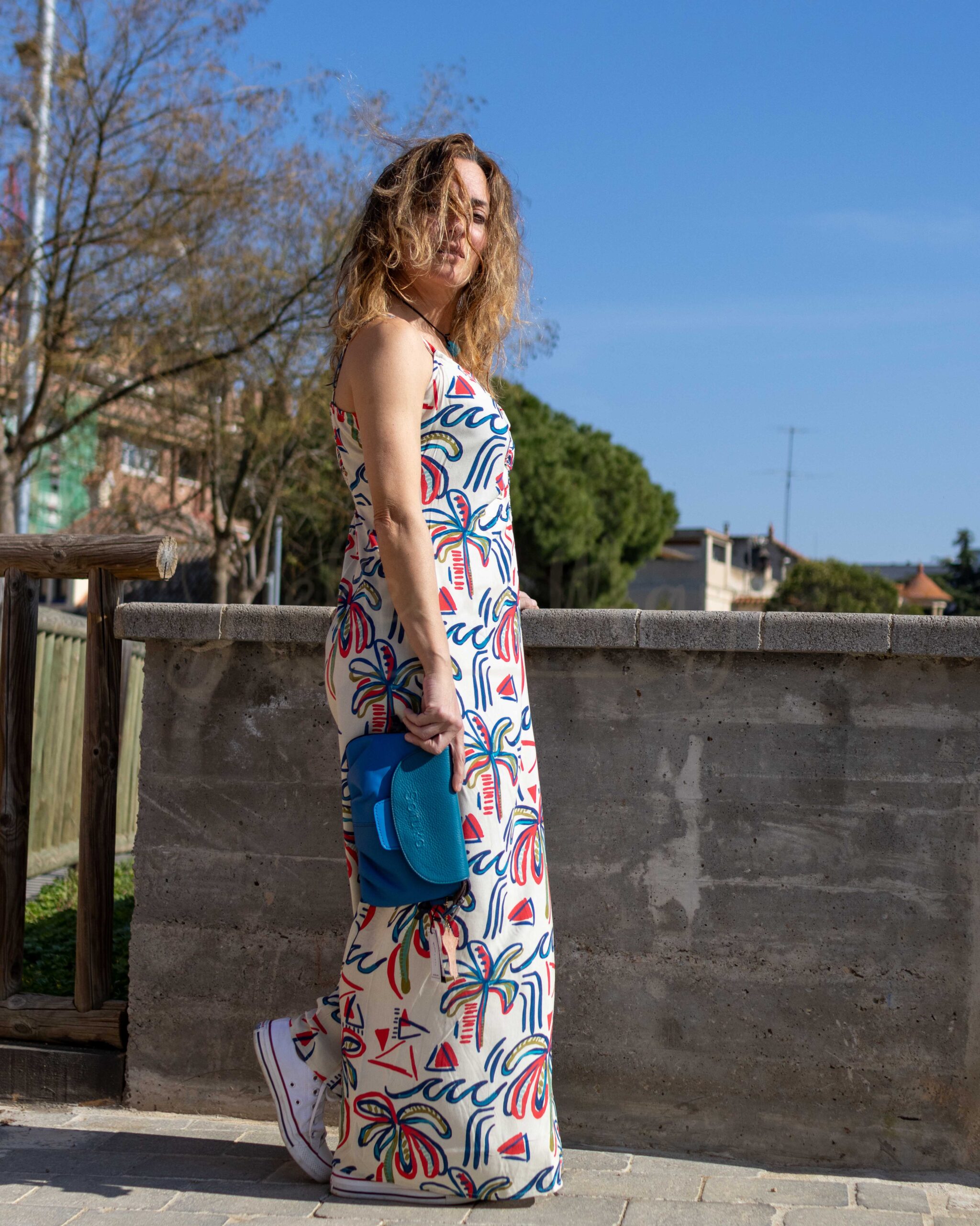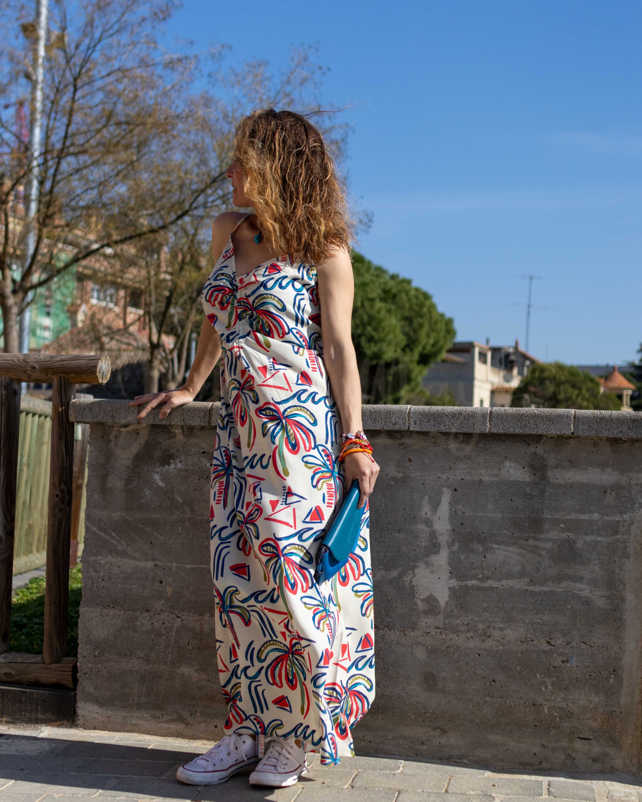 Es un vestido largo (tipo midi tirando a maxi) que cae aproximadamente hasta los tobillos. La silueta es recta y fluida, sin ceñirse en exceso al cuerpo, lo que sugiere comodidad y movimiento, algo muy coherente con el uso de tejido modal, que suele ser suave, transpirable y con buena caída.