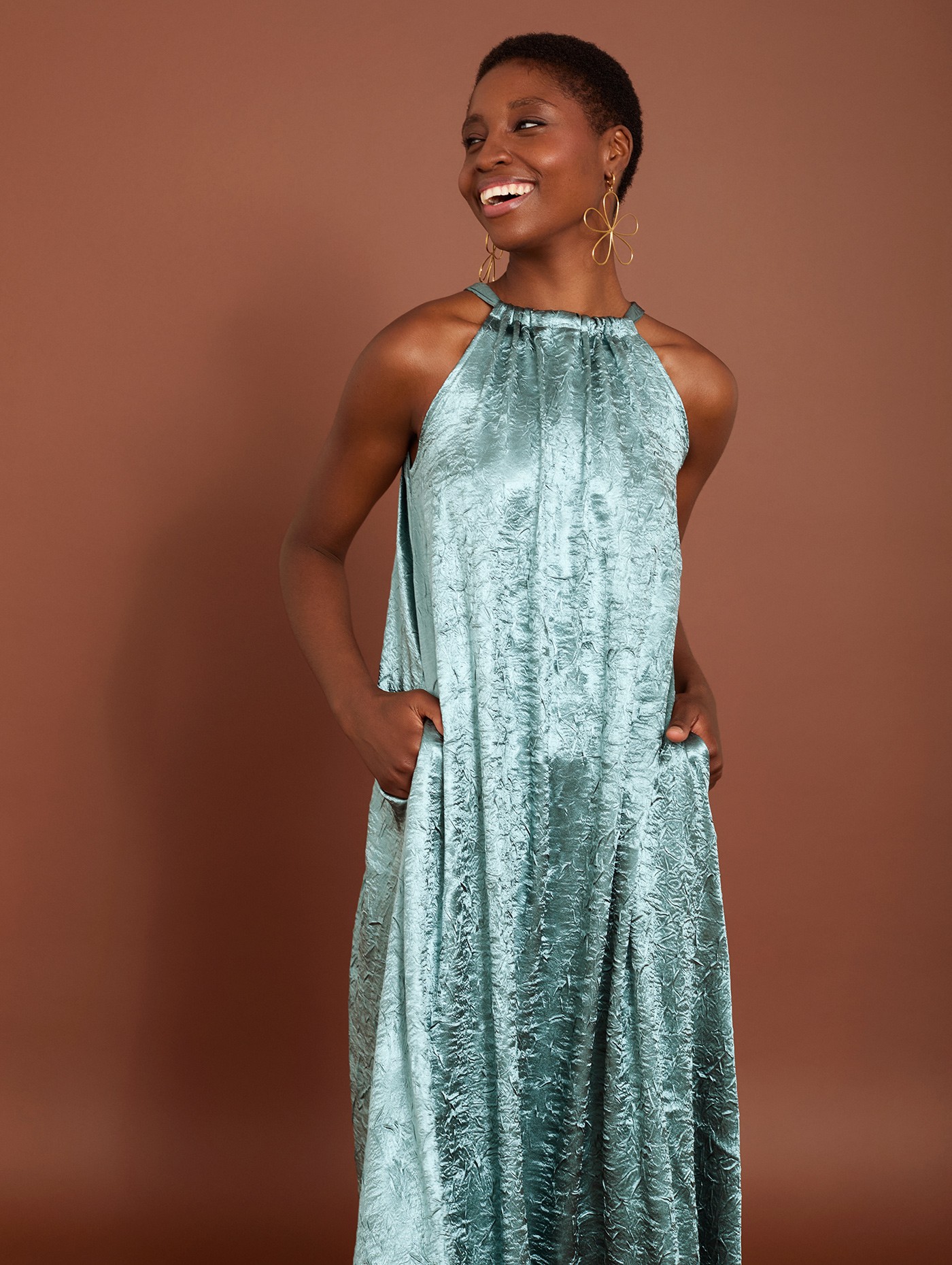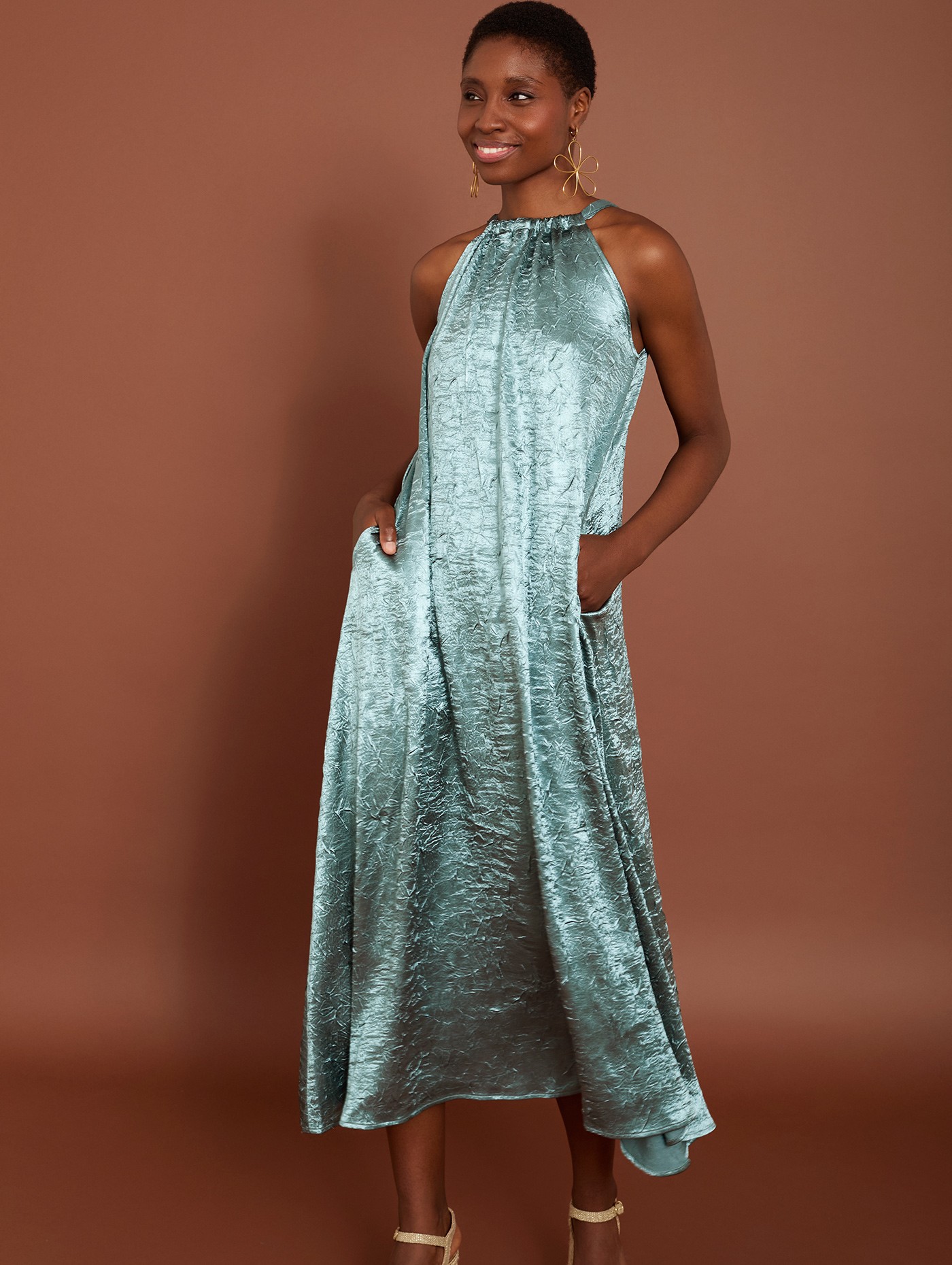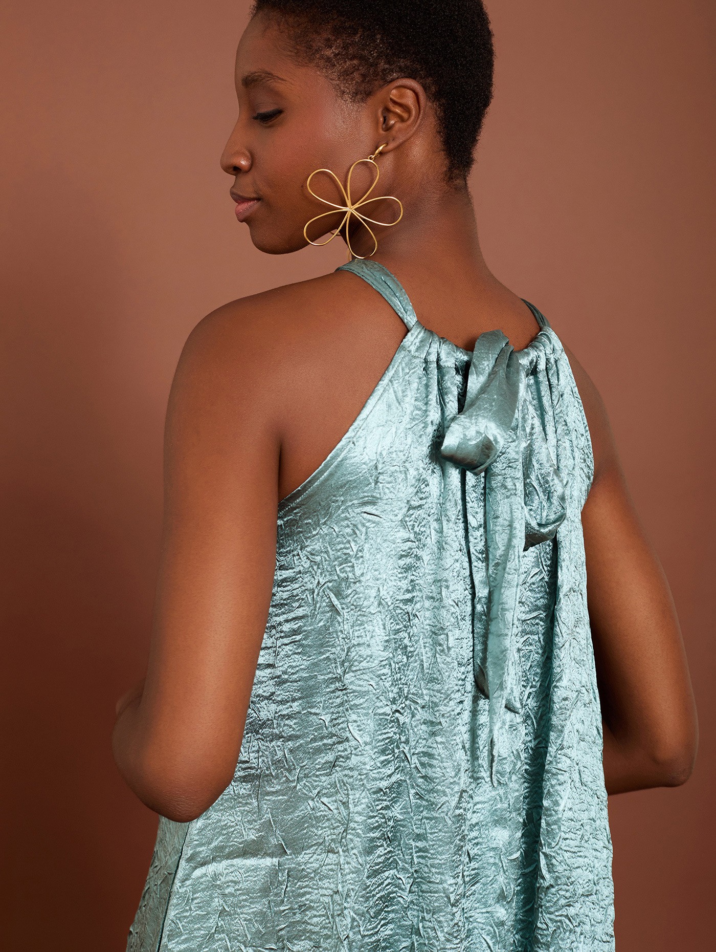 Vestido en tejido satinado metalizado. cuello halter y lazo.